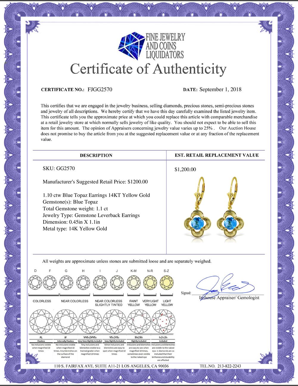 Genuine 14K Yellow Gold 1.1 ctw Blue Topaz Earrings