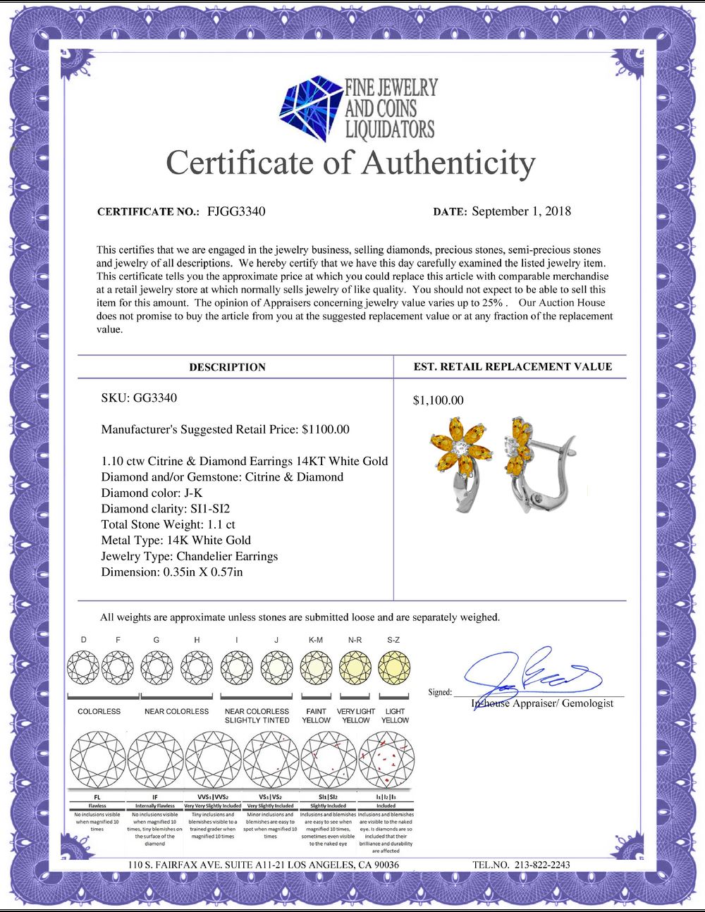 REF-36X3M - SKU: GG3340 ---- Genuine 1.10 ctw Citrine & Diamond Earrings 14KT White Gold