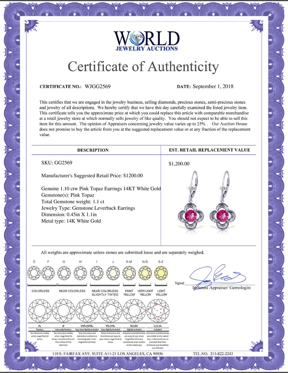 REF-38P2H - SKU: GG2569 ---- Genuine 1.10 ctw Pink Topaz Earrings 14KT Rose Gold