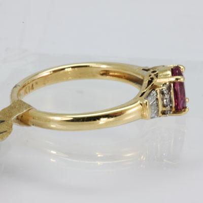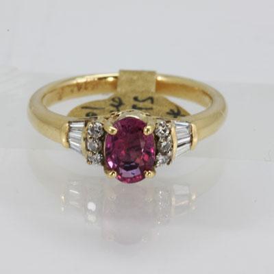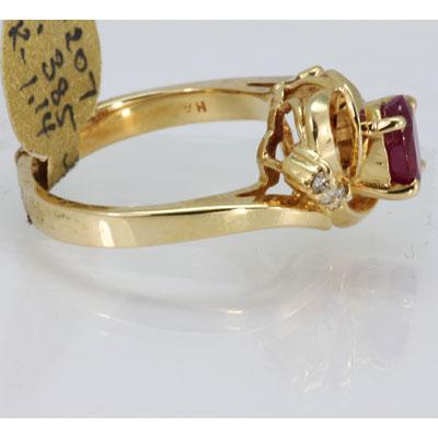 Gemstone: Ruby ; Gemstone Shape: Oval ; Gemstone Size: 6X4 ; Gemstone Weight: 0.94 ; Diamond Count: 6RD ; Diamond Weight: 0.22; Metal Purity: 14KT ; Metal: Yellow Gold ; Ring Size: 6.5