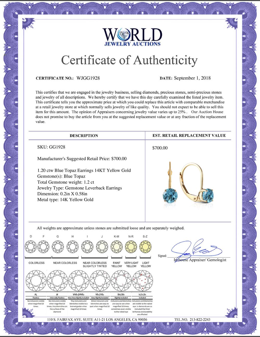 Genuine 14K Yellow Gold 1.2 ctw Blue Topaz Earrings
