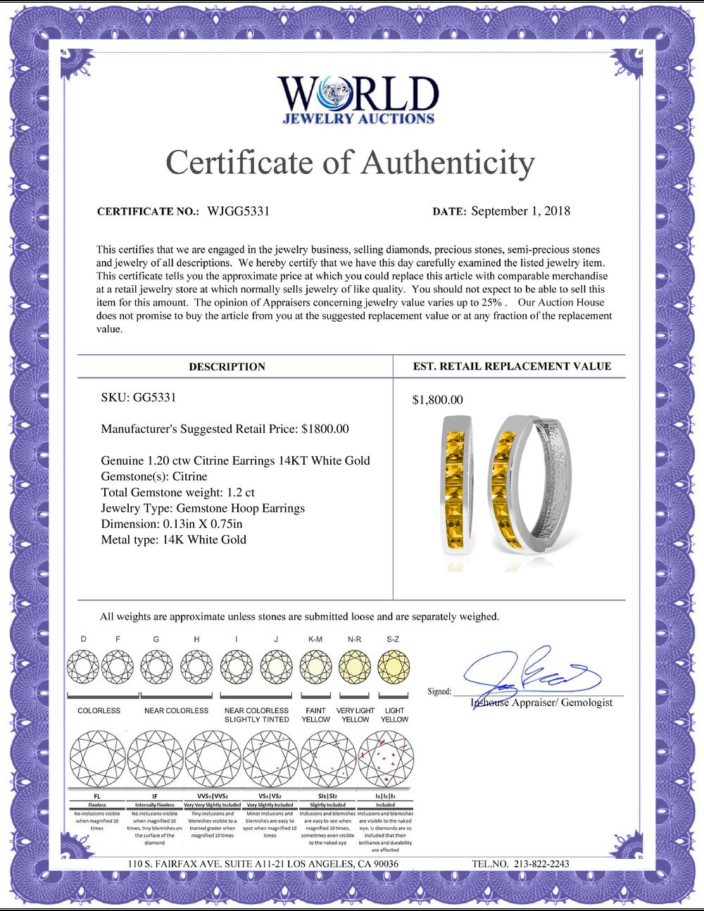 REF-56A7K - SKU: GG5331 ---- Genuine 1.20 ctw Citrine Earrings 14KT White Gold