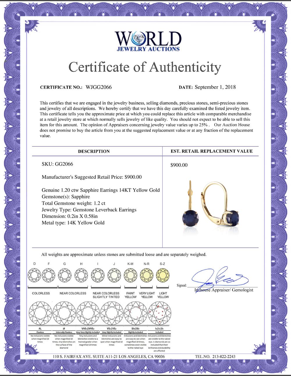 REF-27X2M - SKU: GG2066 ---- Genuine 1.20 ctw Sapphire Earrings 14KT Yellow Gold