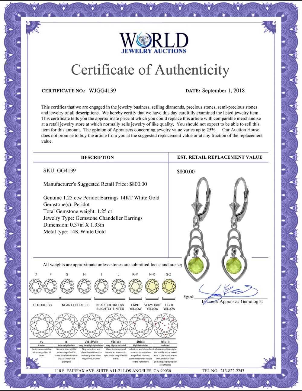 All property is sold “AS IS”, and ALL SALES ARE FINAL. Property is open to thorough public inspection. It is the Bidder’s responsibility to determine condition, age, genuineness, value or any other determinative factor. WJA may attempt to describe the merchandise in advertising and on the Internet but makes no representations. In no event shall WORLD JEWELRY AUCTION be held responsible for having made or implied any warranty of merchantability or fitness for a particular purpose. Bidder shall be the sole judge of value.