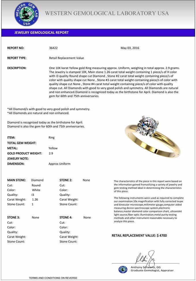 total approx. 2.9 grams. The Jewelry is stamped 10K, Main stone 1.26 carat total weight containing 1 piece/s of H color with