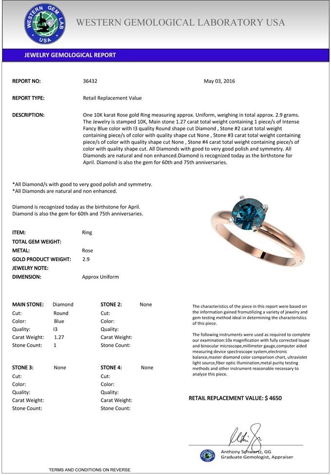 total approx. 2.9 grams. The Jewelry is stamped 10K, Main stone 1.27 carat total weight containing 1 piece/s of Intense Fancy Blue color with