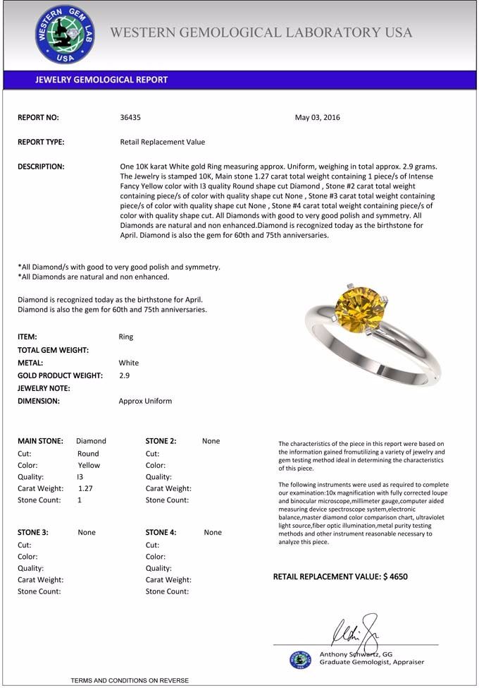 total approx. 2.9 grams. The Jewelry is stamped 10K, Main stone 1.27 carat total weight containing 1 piece/s of Intense Fancy Yellow color with