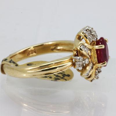 Gemstone: Ruby ; Gemstone Shape: Oval ; Gemstone Size: 6X4 ; Gemstone Weight: 0.85 ; Diamond Count: 18RD ; Diamond Weight: 0.42; Metal Purity: 14KT ; Metal: Yellow Gold ; Ring Size: 6.5