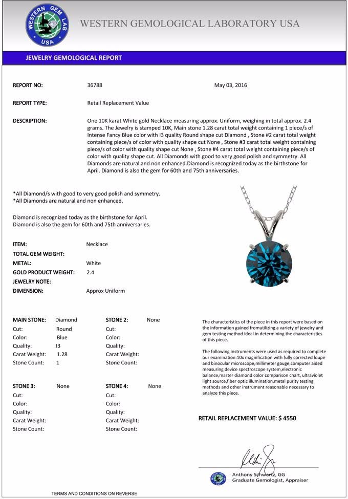 total approx. 2.4 grams. The Jewelry is stamped 10K, Main stone 1.28 carat total weight containing 1 piece/s of Intense Fancy Blue color with