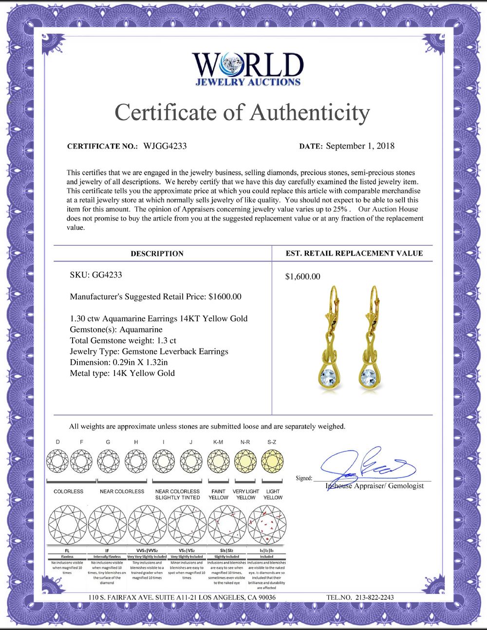 REF-53Y2F - SKU: GG4233 ---- Genuine 1.30 ctw Aquamarine Earrings 14KT Yellow Gold