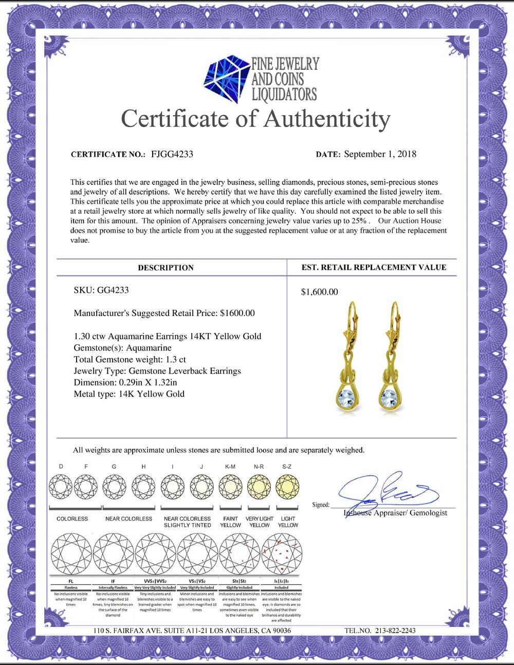 REF-53Y2F - SKU: GG4233 ---- Genuine 1.30 ctw Aquamarine Earrings 14KT Yellow Gold