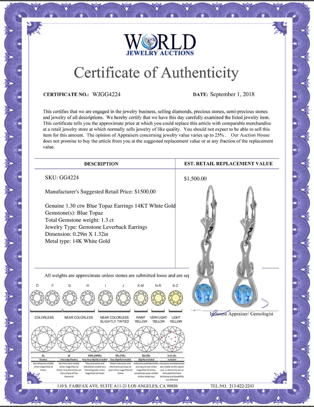 WORLD JEWELRY AUCTION believes to the best of its knowledge that the information presented in any listing has come from reliable sources. Such information is presented solely for the convenience of the Purchaser. WJA makes no warranties of any kind related to the information presented in any listing. WJA further makes no warranties, either express or implied, relating to the value, marketability or condition of the lot described in any listing. Prospective bidders should investigate a lot thoroughly before bidding. By bidding the Bidder acknowledges that Bidder has investigated the lot to his or her satisfaction, or, that Bidder has chosen not to do so, and agrees to accept the lot being bid on with no objections after the sale closes. If you are uncertain please contact us with your questions prior to bidding. If you are still uncertain after we reply, please refrain from bidding. Photos other graphic material contained in any listing of generic or duplicate lots may be stock presentations and not necessarily of the specific lot.