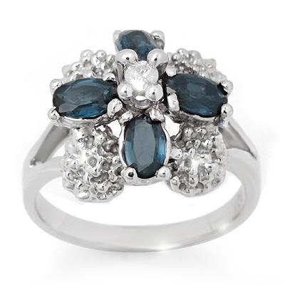 Diamond: 1 Round cut @ 0.08 ctw Clarity: SI-I Color: H-K Gemstone: Natural Sapphire Gemstone color: Blue Gemstone quality: Good-to-Very Good Gemstone Cut & Weight: 4 Oval cut @ 1.25 ctw Metal Purity & Color : 10K Gold-White Gold weight: 4.85 grams Ring size (US): 6 Dimension: Approx. 1/2" x 1/2" Consignor: World Jewelry Outlet Delivery: Within 10 business days