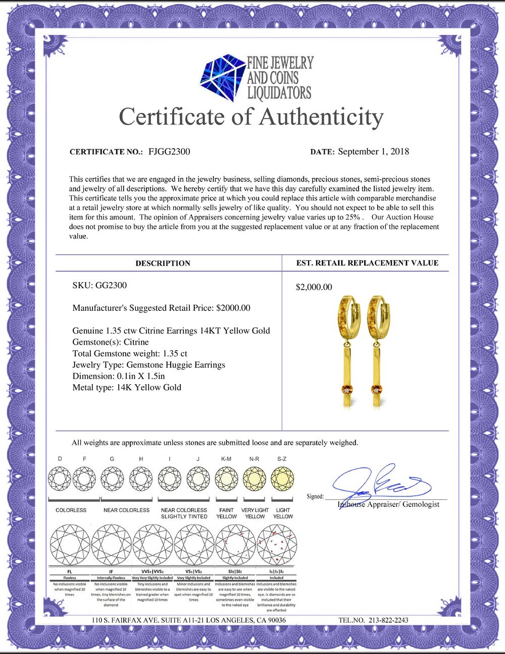 REF-66H2X - SKU: GG2300 ---- Genuine 1.35 ctw Citrine Earrings 14KT Yellow Gold