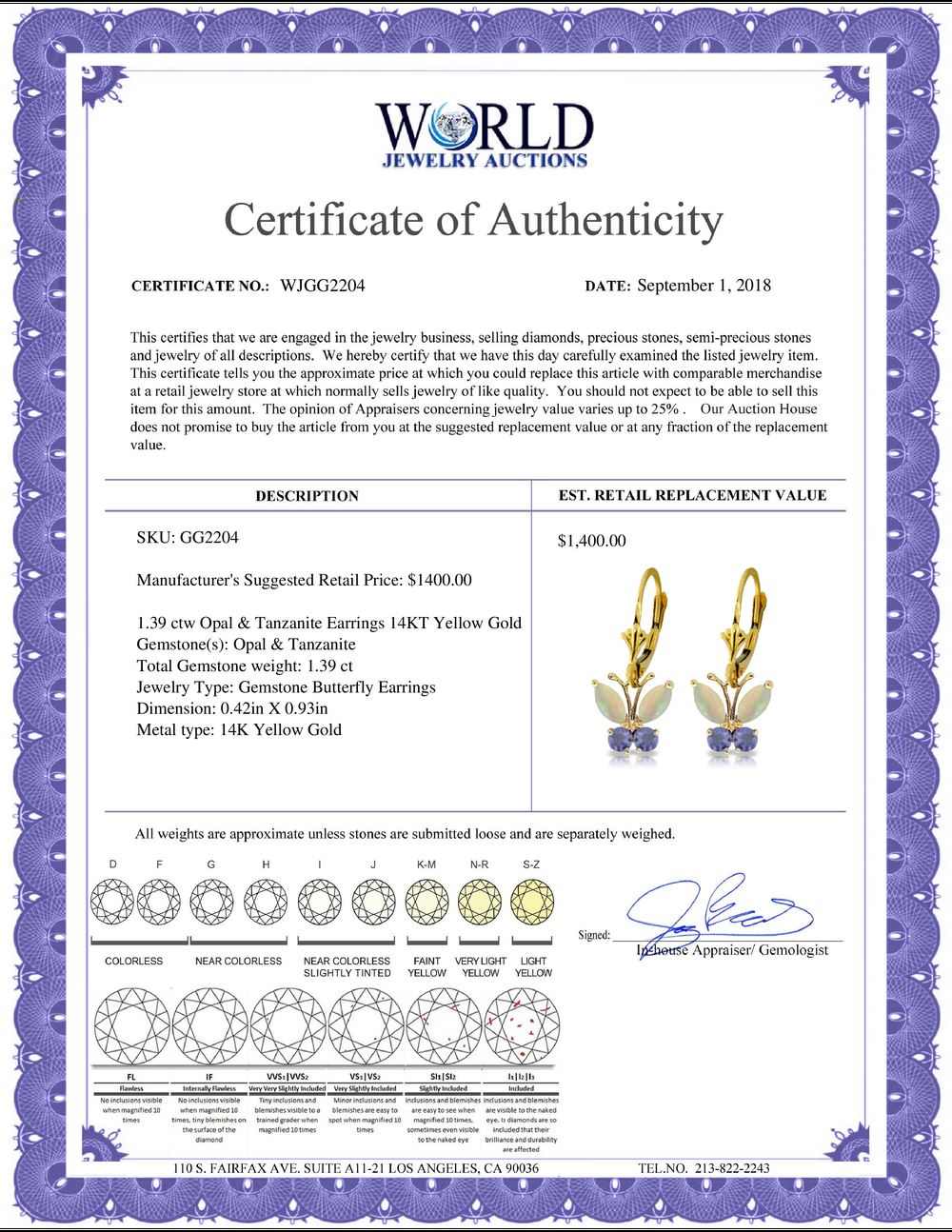REF-43V6W - SKU: GG2204 ---- Genuine 1.39 ctw Opal & Tanzanite Earrings 14KT Yellow Gold