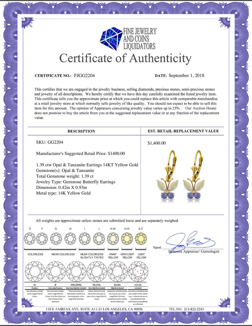 REF-43V6W - SKU: GG2204 ---- Genuine 1.39 ctw Opal & Tanzanite Earrings 14KT Yellow Gold