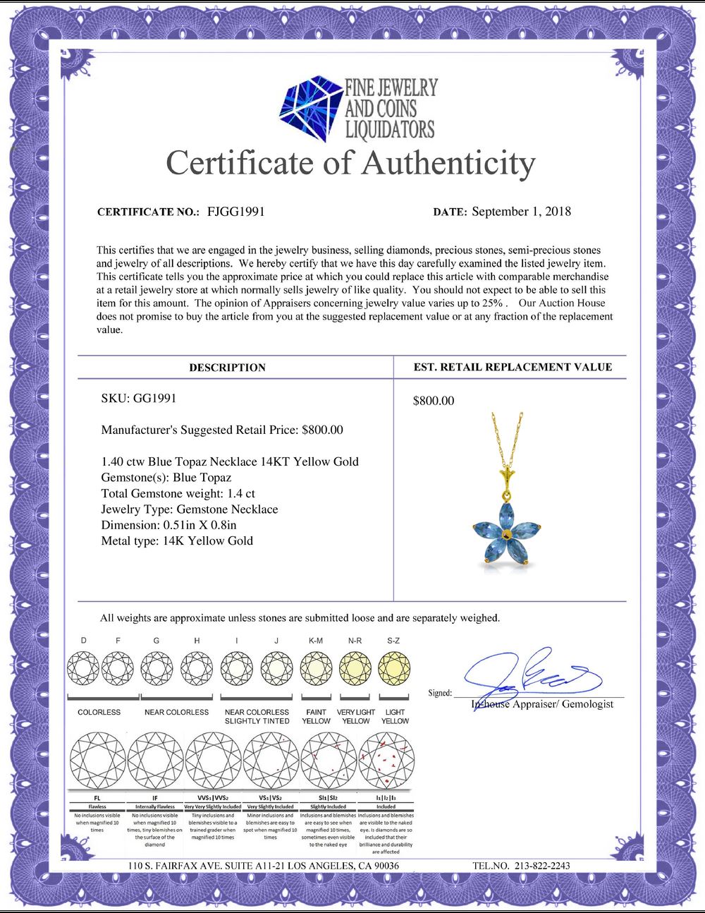 REF-25X8M - SKU: GG1991 ---- Genuine 1.40 ctw Blue Topaz Necklace 14KT Yellow Gold