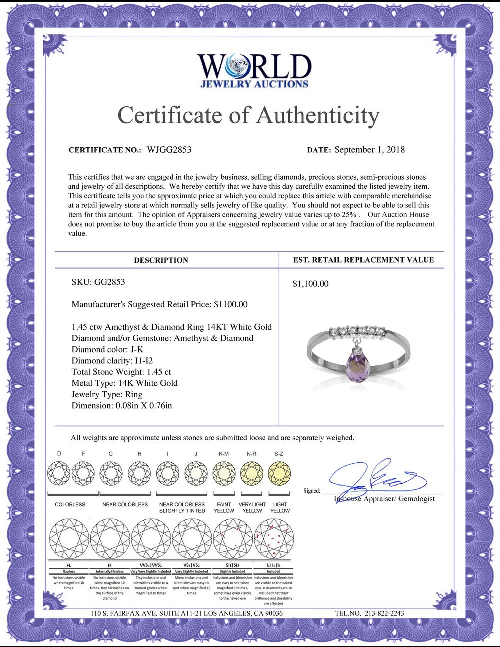 REF-34X3M - SKU: GG2853 ---- Genuine 1.45 ctw Amethyst & Diamond Ring 14KT White Gold