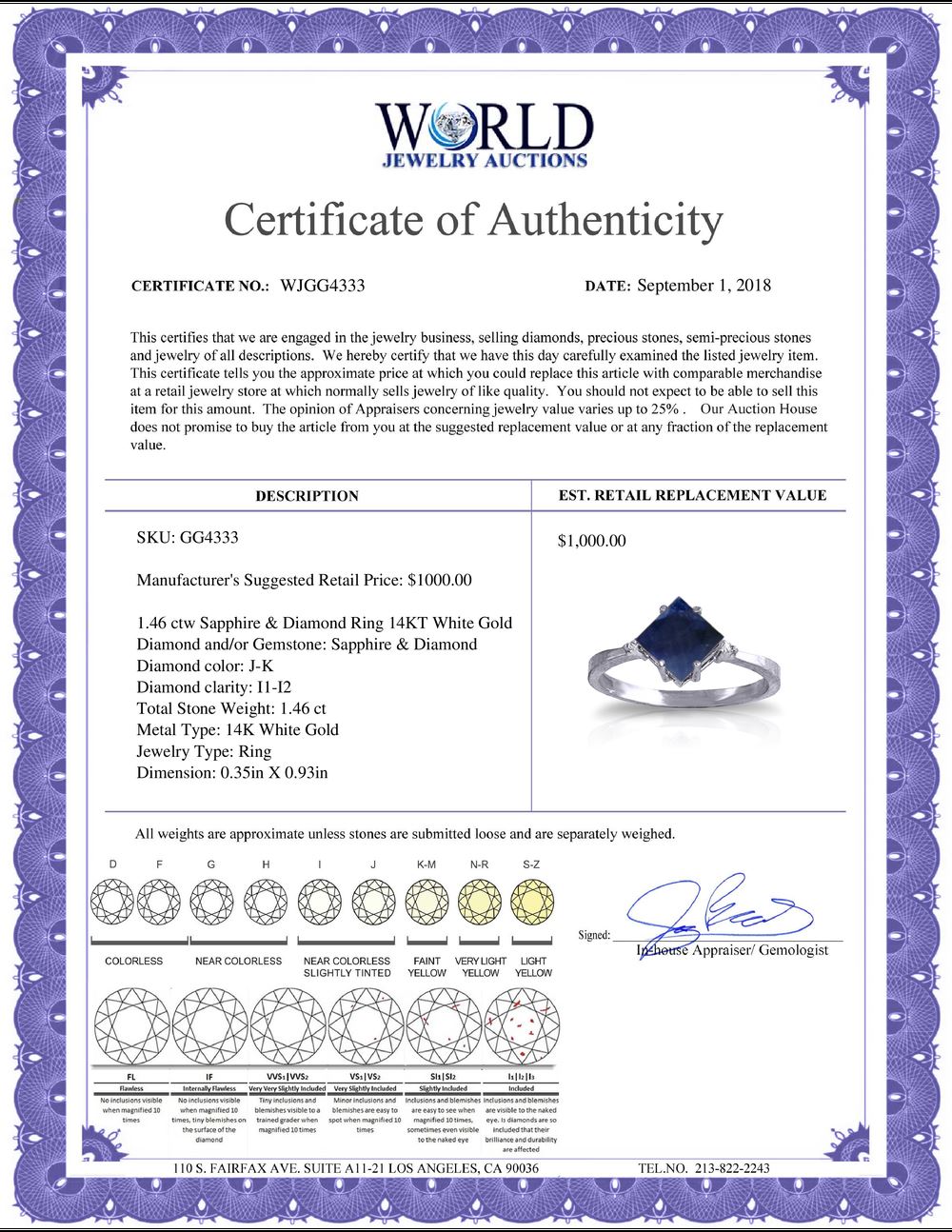 WORLD JEWELRY AUCTION believes to the best of its knowledge that the information presented in any listing has come from reliable sources. Such information is presented solely for the convenience of the Purchaser. WJA makes no warranties of any kind related to the information presented in any listing. WJA further makes no warranties, either express or implied, relating to the value, marketability or condition of the lot described in any listing. Prospective bidders should investigate a lot thoroughly before bidding. By bidding the Bidder acknowledges that Bidder has investigated the lot to his or her satisfaction, or, that Bidder has chosen not to do so, and agrees to accept the lot being bid on with no objections after the sale closes. If you are uncertain please contact us with your questions prior to bidding. If you are still uncertain after we reply, please refrain from bidding. Photos other graphic material contained in any listing of generic or duplicate lots may be stock presentations and not necessarily of the specific lot.