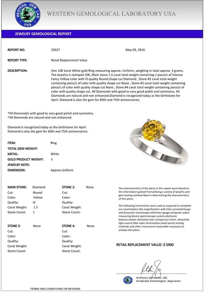 total approx. 3 grams. The Jewelry is stamped 10K, Main stone 1.5 carat total weight containing 1 piece/s of Intense Fancy Yellow color with