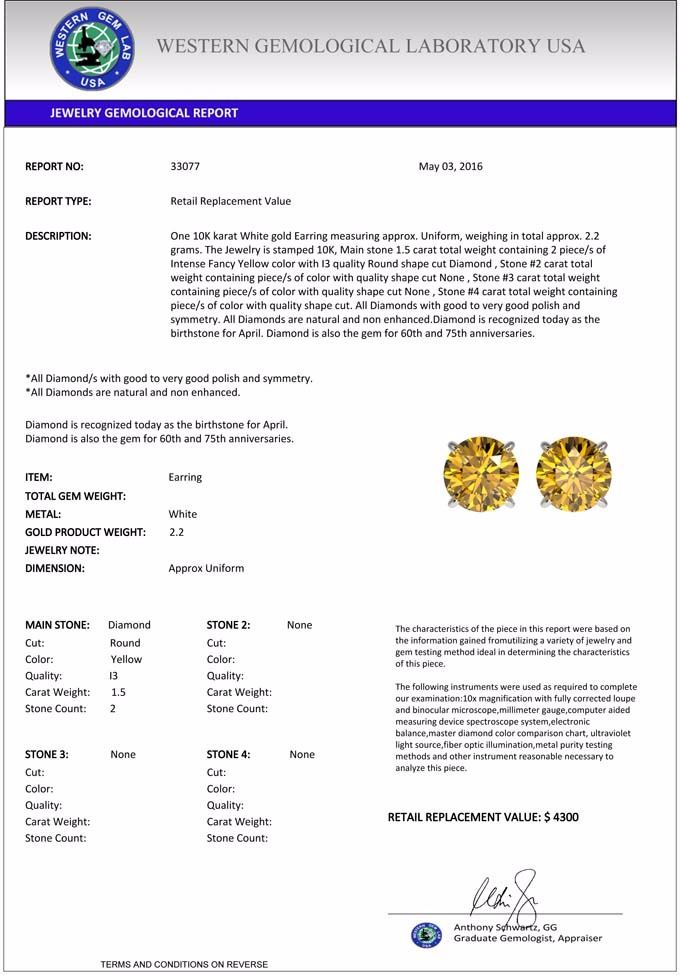 total approx. 2.2 grams. The Jewelry is stamped 10K, Main stone 1.5 carat total weight containing 2 piece/s of Intense Fancy Yellow color with