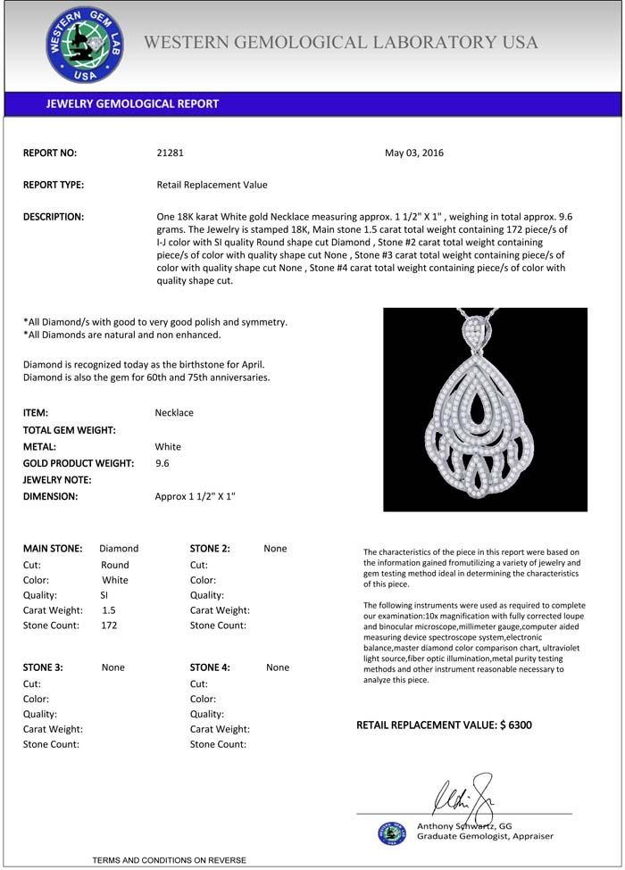 DESCRIPTION OF ARTICLE: One 18K karat White gold Necklace measuring approx. 1 1/2" X 1" , weighing in