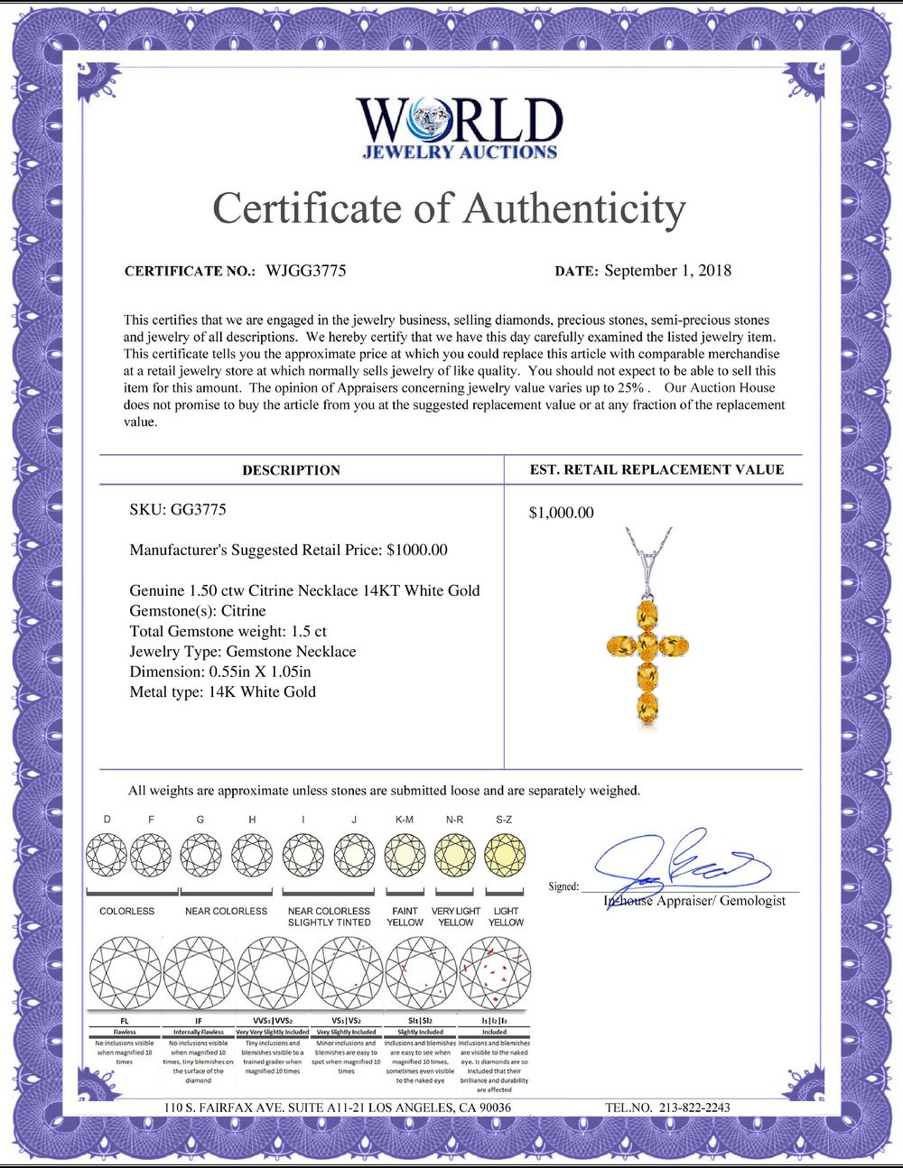 All property is sold “AS IS”, and ALL SALES ARE FINAL. Property is open to thorough public inspection. It is the Bidder’s responsibility to determine condition, age, genuineness, value or any other determinative factor. WJA may attempt to describe the merchandise in advertising and on the Internet but makes no representations. In no event shall WORLD JEWELRY AUCTION be held responsible for having made or implied any warranty of merchantability or fitness for a particular purpose. Bidder shall be the sole judge of value.
