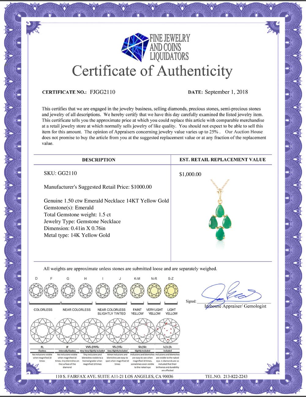 REF-30P7H - SKU: GG2110 ---- Genuine 1.50 ctw Emerald Necklace 14KT Yellow Gold