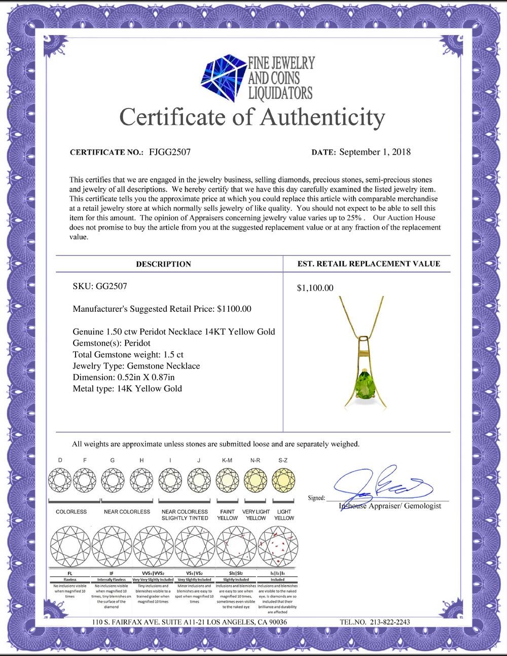 REF-35R4P - SKU: GG2507 ---- Genuine 1.50 ctw Peridot Necklace 14KT Yellow Gold