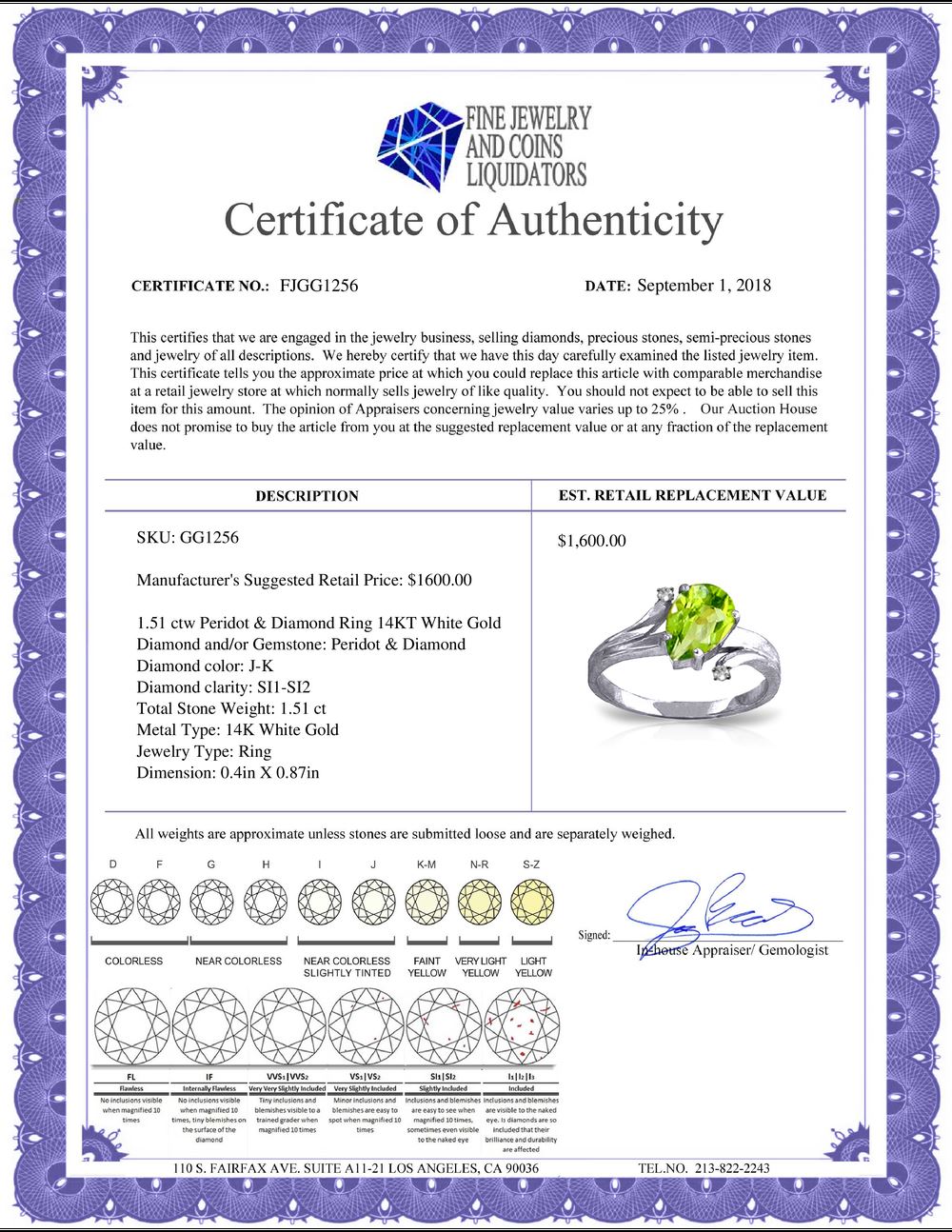 REF-51R4P - SKU: GG1256 ---- Genuine 1.51 ctw Peridot & Diamond Ring 14KT White Gold
