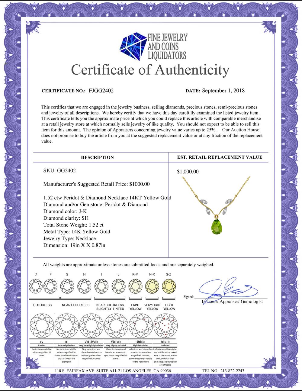 REF-30V7W - SKU: GG2402 ---- Genuine 1.52 ctw Peridot & Diamond Necklace 14KT Yellow Gold
