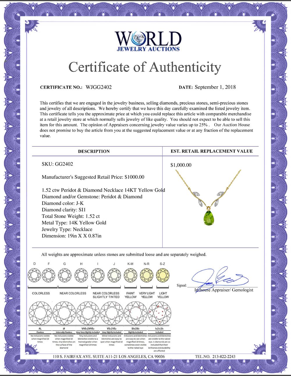 REF-30V7W - SKU: GG2402 ---- Genuine 1.52 ctw Peridot & Diamond Necklace 14KT Yellow Gold