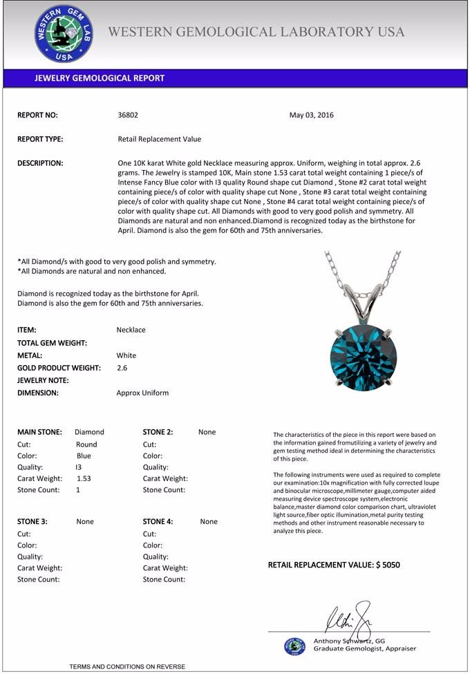 total approx. 2.6 grams. The Jewelry is stamped 10K, Main stone 1.53 carat total weight containing 1 piece/s of Intense Fancy Blue color with