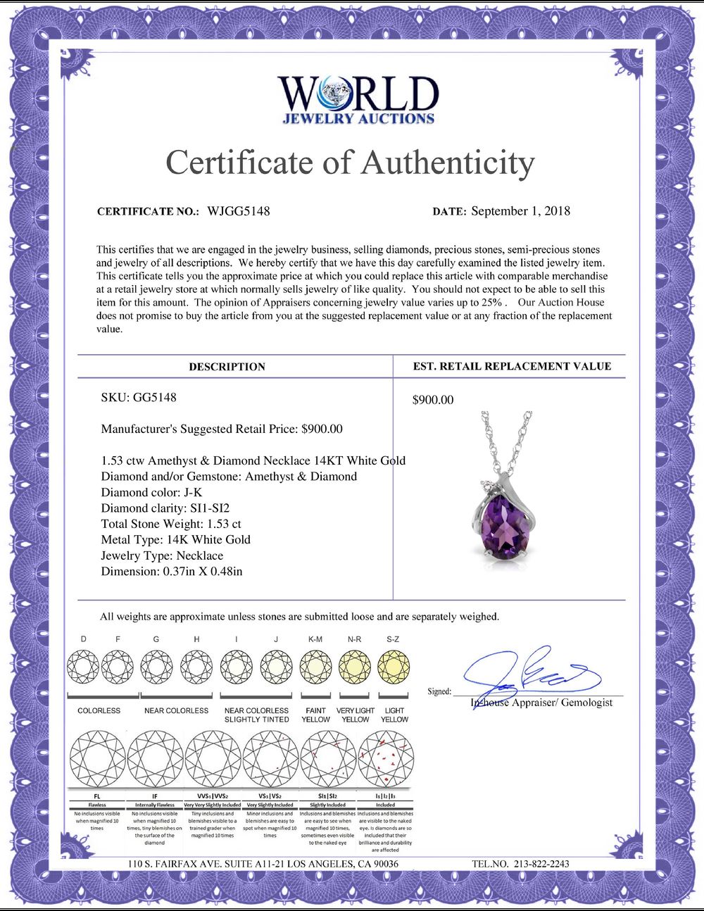 REF-28A3K - SKU: GG5148 ---- Genuine 1.53 ctw Amethyst & Diamond Necklace 14KT White Gold