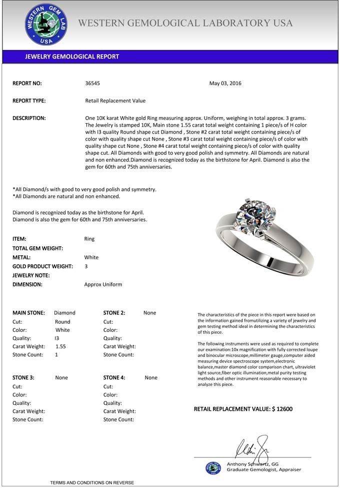 total approx. 3 grams. The Jewelry is stamped 10K, Main stone 1.55 carat total weight containing 1 piece/s of H color with