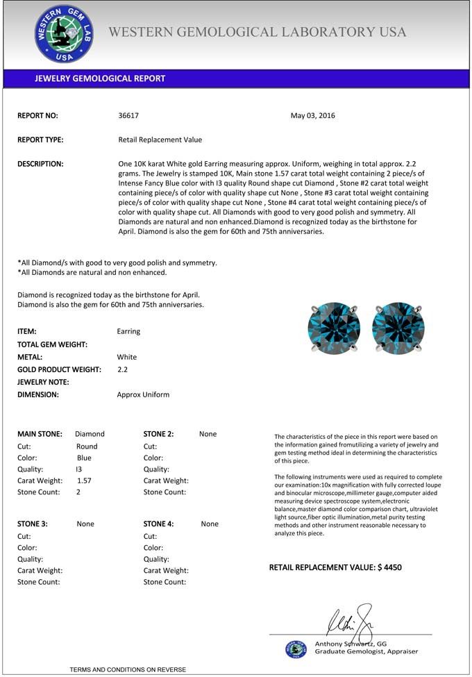 total approx. 2.2 grams. The Jewelry is stamped 10K, Main stone 1.57 carat total weight containing 2 piece/s of Intense Fancy Blue color with