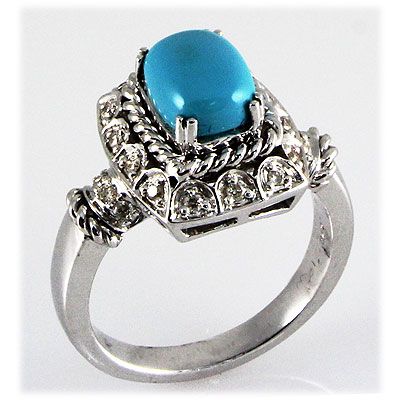 Genuine 1.63ctw Turquoise Diamond Ring 14kt W/G 6.80g **|**|** Mainstone: Turquiose; Total CTW: 1.63 ; Gem QTY: 1 ; Gem CTW: 1.42 ; Dia/CTW: 0.21 ; Diamond Count: 22 ; Diamond Shape: Round ; Grams/Total: 6.8 ; Metal/Purity: 14kt W/G ; MSRP: $1200