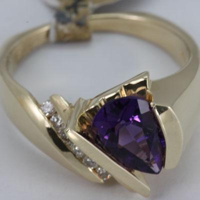 Gemstone: Amethyst ; Diamond Count 1: 6RD ; Diamond Weight: 0.13 ; Gemstone Color: Purple ; Gemstone Count: 1 Pear Shape ; Gemstone Weight: 1.56 ; Dimension: 10X7MM ; Metal Purity: 14KT ; Metal: Gold-Yellow ; Ring Size: 7