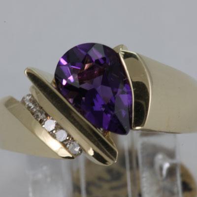 Gemstone: Amethyst ; Diamond Count 1: 6RD ; Diamond Weight: 0.13 ; Gemstone Color: Purple ; Gemstone Count: 1 Pear Shape ; Gemstone Weight: 1.56 ; Dimension: 10X7MM ; Metal Purity: 14KT ; Metal: Gold-Yellow ; Ring Size: 7