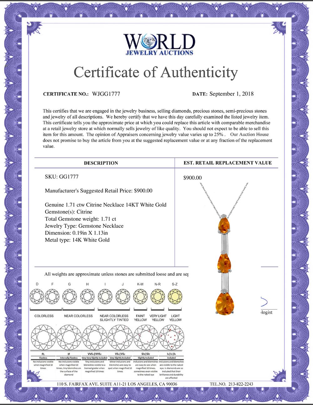 All property is sold “AS IS”, and ALL SALES ARE FINAL. Property is open to thorough public inspection. It is the Bidder’s responsibility to determine condition, age, genuineness, value or any other determinative factor. WJA may attempt to describe the merchandise in advertising and on the Internet but makes no representations. In no event shall WORLD JEWELRY AUCTION be held responsible for having made or implied any warranty of merchantability or fitness for a particular purpose. Bidder shall be the sole judge of value.