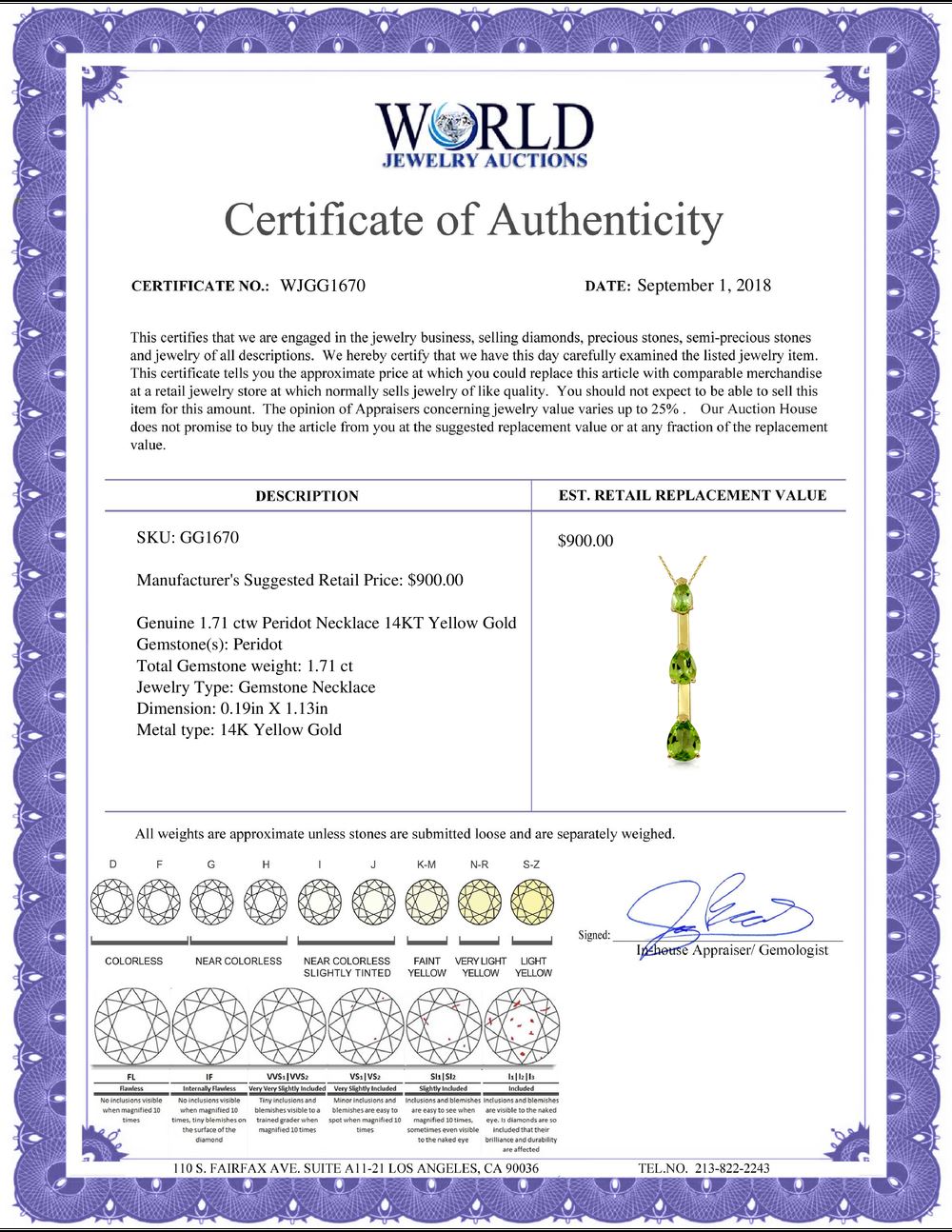 REF-27N5R - SKU: GG1670 ---- Genuine 1.71 ctw Peridot Necklace 14KT Yellow Gold