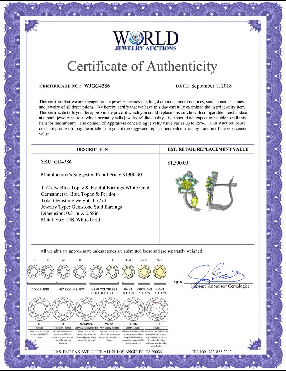 All property is sold “AS IS”, and ALL SALES ARE FINAL. Property is open to thorough public inspection. It is the Bidder’s responsibility to determine condition, age, genuineness, value or any other determinative factor. WJA may attempt to describe the merchandise in advertising and on the Internet but makes no representations. In no event shall WORLD JEWELRY AUCTION be held responsible for having made or implied any warranty of merchantability or fitness for a particular purpose. Bidder shall be the sole judge of value.