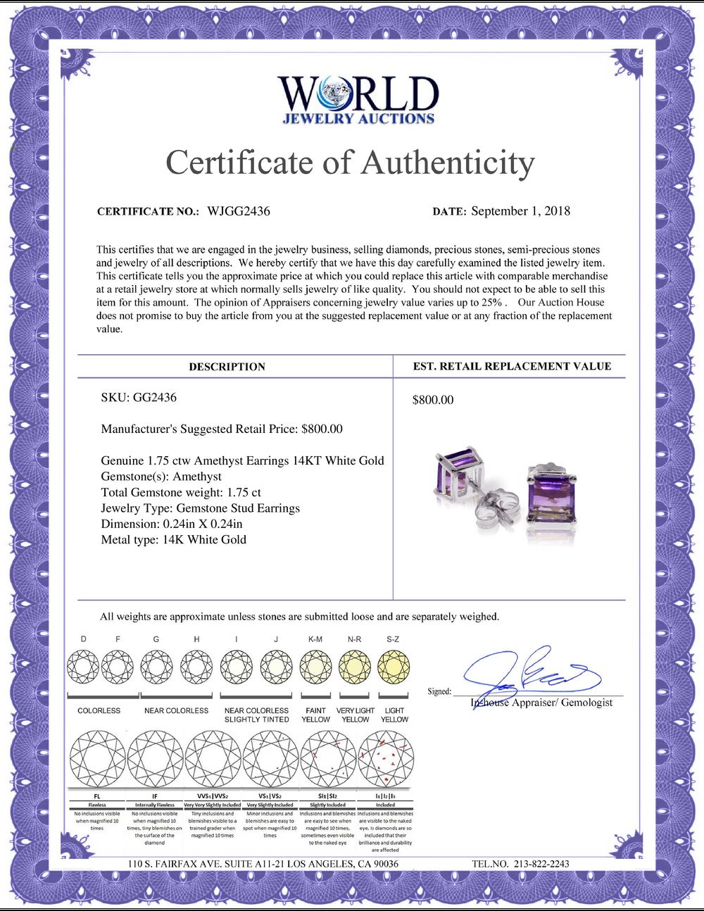 All property is sold “AS IS”, and ALL SALES ARE FINAL. Property is open to thorough public inspection. It is the Bidder’s responsibility to determine condition, age, genuineness, value or any other determinative factor. WJA may attempt to describe the merchandise in advertising and on the Internet but makes no representations. In no event shall WORLD JEWELRY AUCTION be held responsible for having made or implied any warranty of merchantability or fitness for a particular purpose. Bidder shall be the sole judge of value.