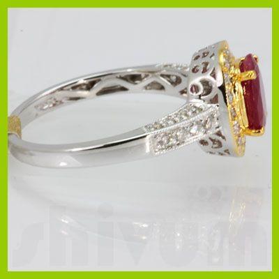 Gemstone: Ruby ; Gemstone Shape: Oval ; Gemstone Size: 7X6 ; Gemstone Weight: 1.23 ; Diamond Count: 40RD ; Diamond Weight: 0.53; Metal Purity: 18KT ; Metal: 2 Tone ; Ring Size: 6.5