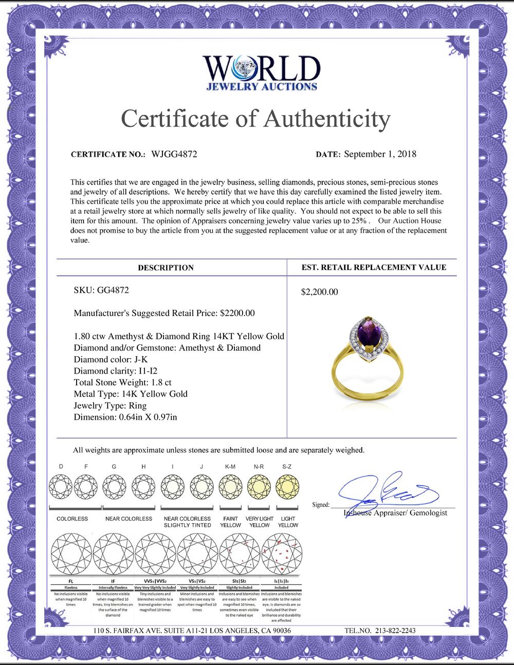 All property is sold “AS IS”, and ALL SALES ARE FINAL. Property is open to thorough public inspection. It is the Bidder’s responsibility to determine condition, age, genuineness, value or any other determinative factor. WJA may attempt to describe the merchandise in advertising and on the Internet but makes no representations. In no event shall WORLD JEWELRY AUCTION be held responsible for having made or implied any warranty of merchantability or fitness for a particular purpose. Bidder shall be the sole judge of value.