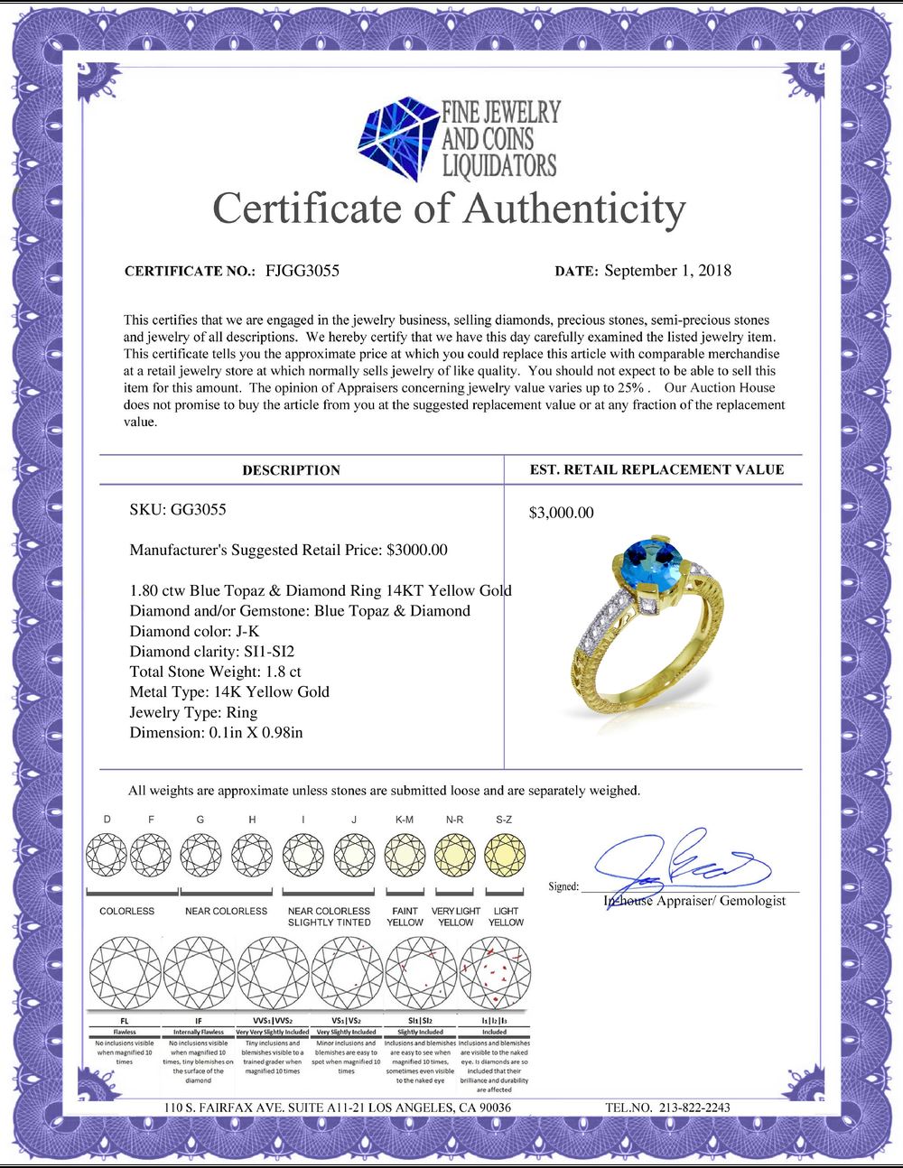 REF-98V3W - SKU: GG3055 ---- Genuine 1.80 ctw Blue Topaz & Diamond Ring 14KT Yellow Gold