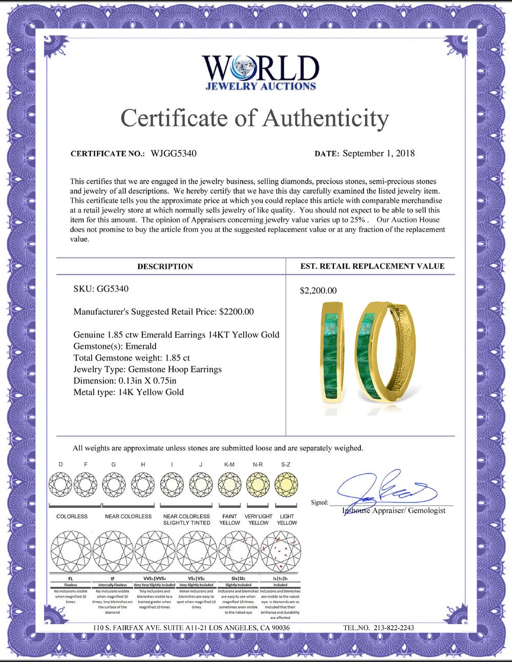 All property is sold “AS IS”, and ALL SALES ARE FINAL. Property is open to thorough public inspection. It is the Bidder’s responsibility to determine condition, age, genuineness, value or any other determinative factor. WJA may attempt to describe the merchandise in advertising and on the Internet but makes no representations. In no event shall WORLD JEWELRY AUCTION be held responsible for having made or implied any warranty of merchantability or fitness for a particular purpose. Bidder shall be the sole judge of value.