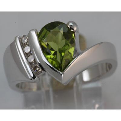 Gemstone: Peridot ; Diamond Count 1: 4RD ; Diamond Weight: 0.14 ; Gemstone Color: Green ; Gemstone Count: 1 Pear Shape ; Gemstone Weight: 1.71 ; Dimension: 9X7MM ; Metal Purity: 14KT ; Metal: Gold-White ; Ring Size: 7