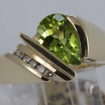 Gemstone: Peridot ; Diamond Count 1: 6RD ; Diamond Weight: 0.13 ; Gemstone Color: Green ; Gemstone Count: 1 Pear Shape ; Gemstone Weight: 1.84 ; Dimension: 10X7MM ; Metal Purity: 14KT ; Metal: Gold-Yellow ; Ring Size: 7