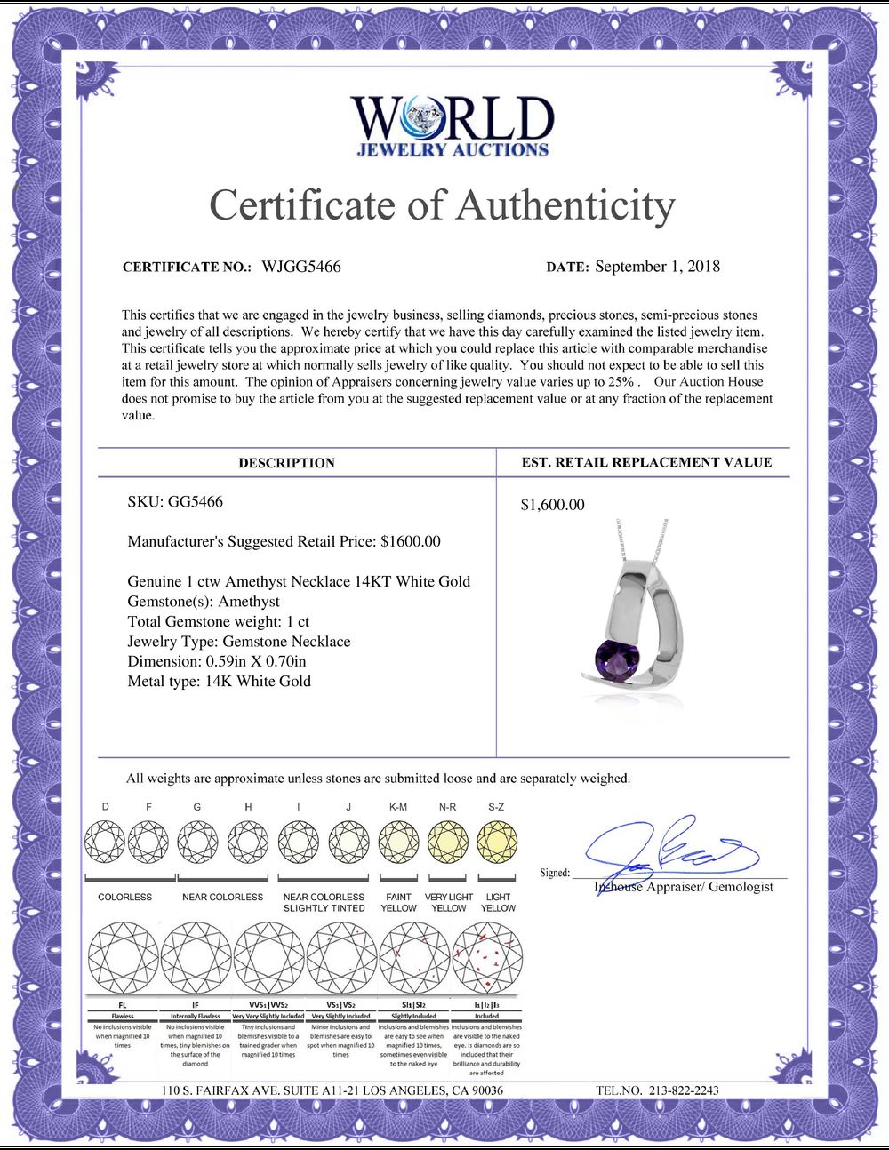 REF-50W5Y - SKU: GG5466 ---- Genuine 1 ctw Amethyst Necklace 14KT White Gold